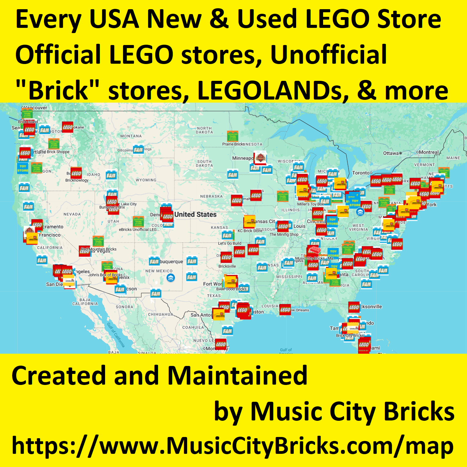 This map of Official LEGO stores and unofficial "Brick" shops is maintained by Music City Bricks for the benefit of the LEGO fan community.